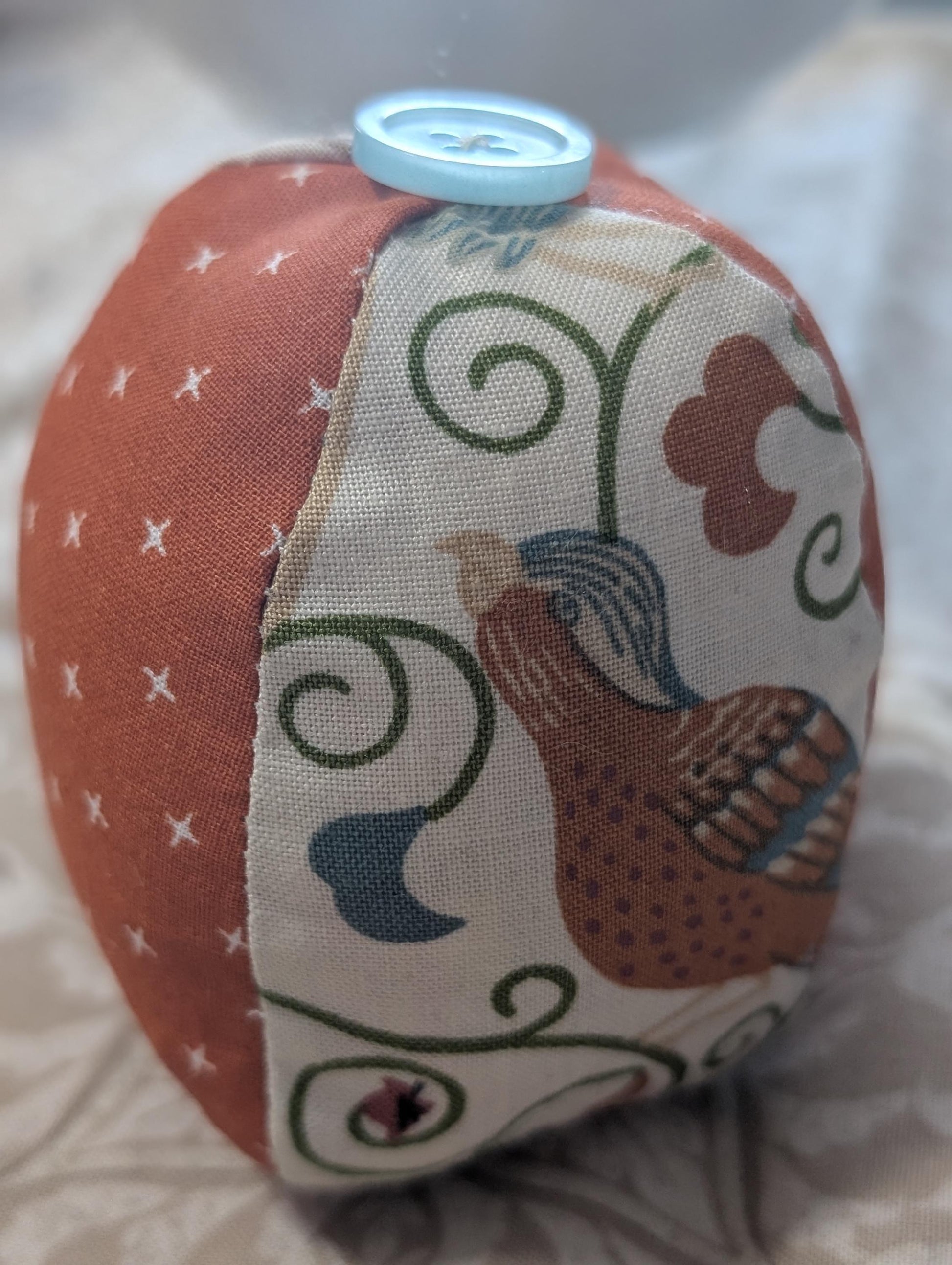 Lightly stuffed fabric Easter egg shaped pin cushion filled with a mixture of polyfil, weighted beads and clean cotton scraps.