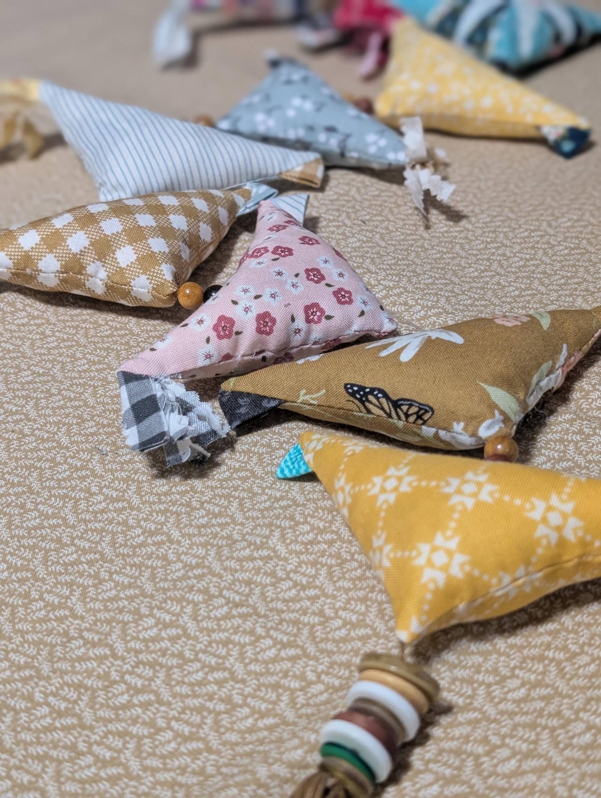 In Indian culture, "prosperity hens," also known as "tota" or "bell totas," are decorative hangings believed to bring good luck and prosperity to homes and families when hung in doorways or windows. These were usually made and given as gifts for special milestones or handed down generation after generation. These special hens were made using the tiny leftovers of special fabrics in the Stitchysassanach shop. Custom order customers might recognize some. In a year where egg prices are soaring I felt like we could all use a totem of hope for good luck this year. I omitted the bell at the end and instead used embroidery thread and buttons found in estate sales that have been waiting years to be found as a special recognition to all the stitchers out there. I have also made a single hanging hen, since some of us can't have an entire flock, dang HOAs, to bring luck and prosperity to those who travel.