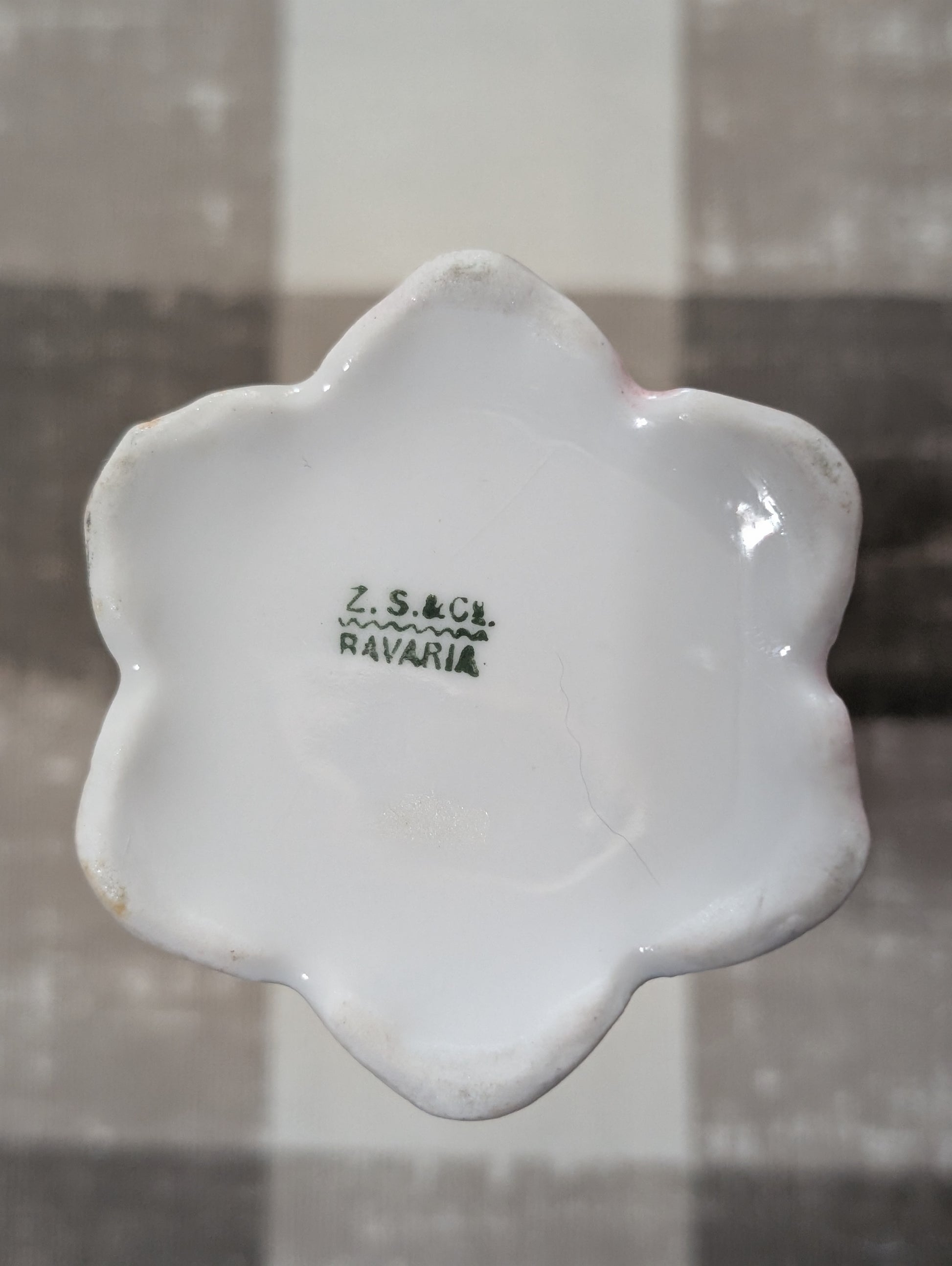 This listing is for an antique porcelain hat pin vase marked "Z.S & Co. Barvaria" which was a common vanity item used to store and display hat pins. Generally these were handpainted and decorated with floral designs.